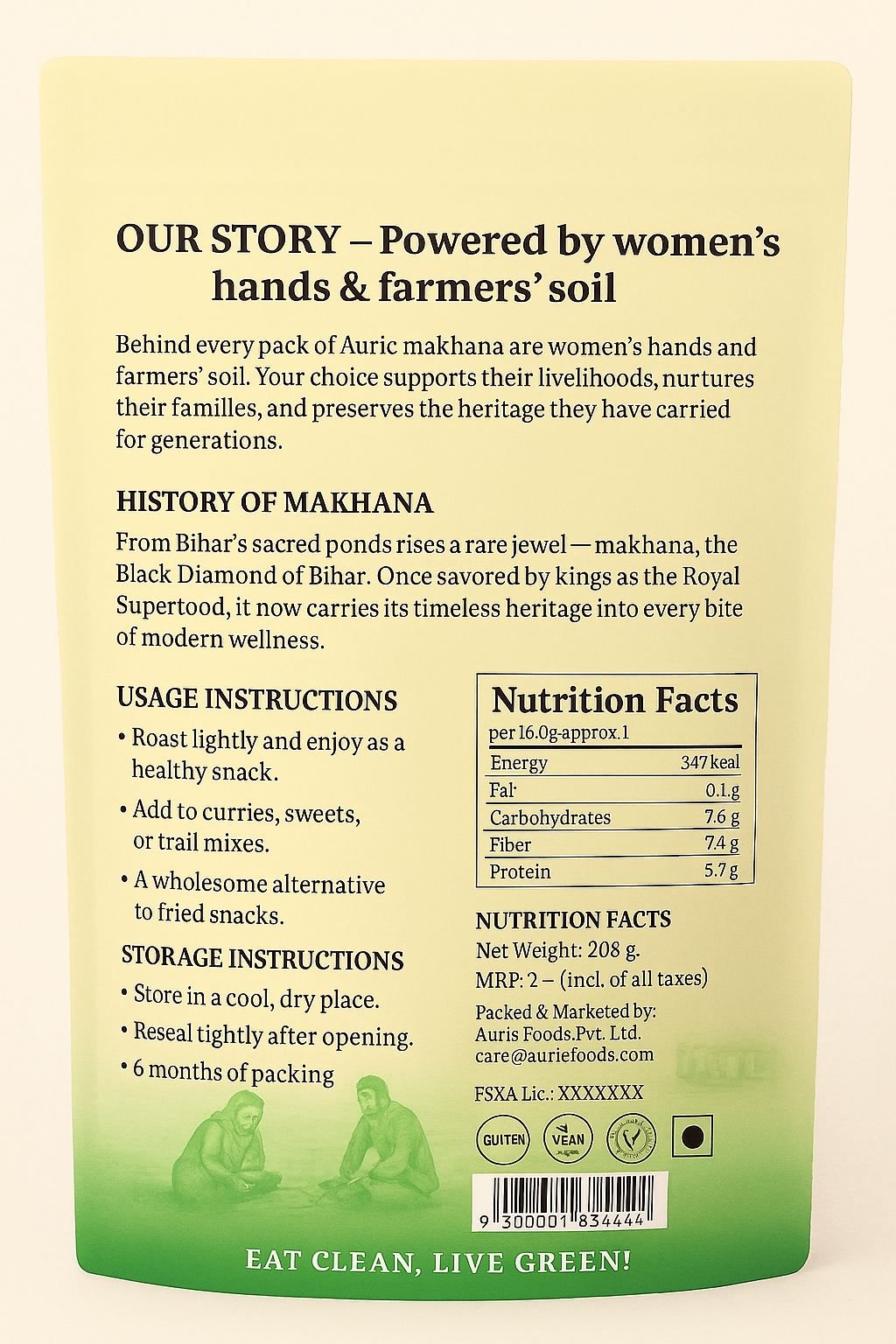 Behind every pack of Auric makhana are women’s hands and farmers’ soil. Your choice supports their livelihoods, nurtures their families, and preserves the heritage they have carried for generations.”